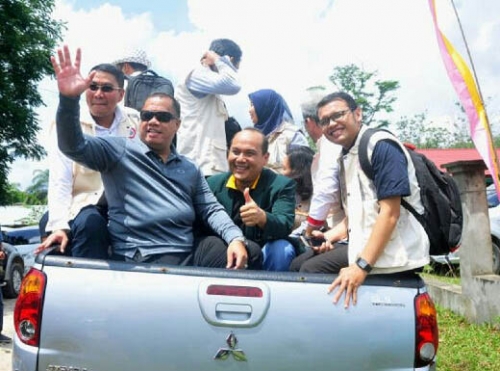 Bupati Indragiri Hulu, Yopi Arianto melambaikan tangan saat meninjau pembangunan di daerah.